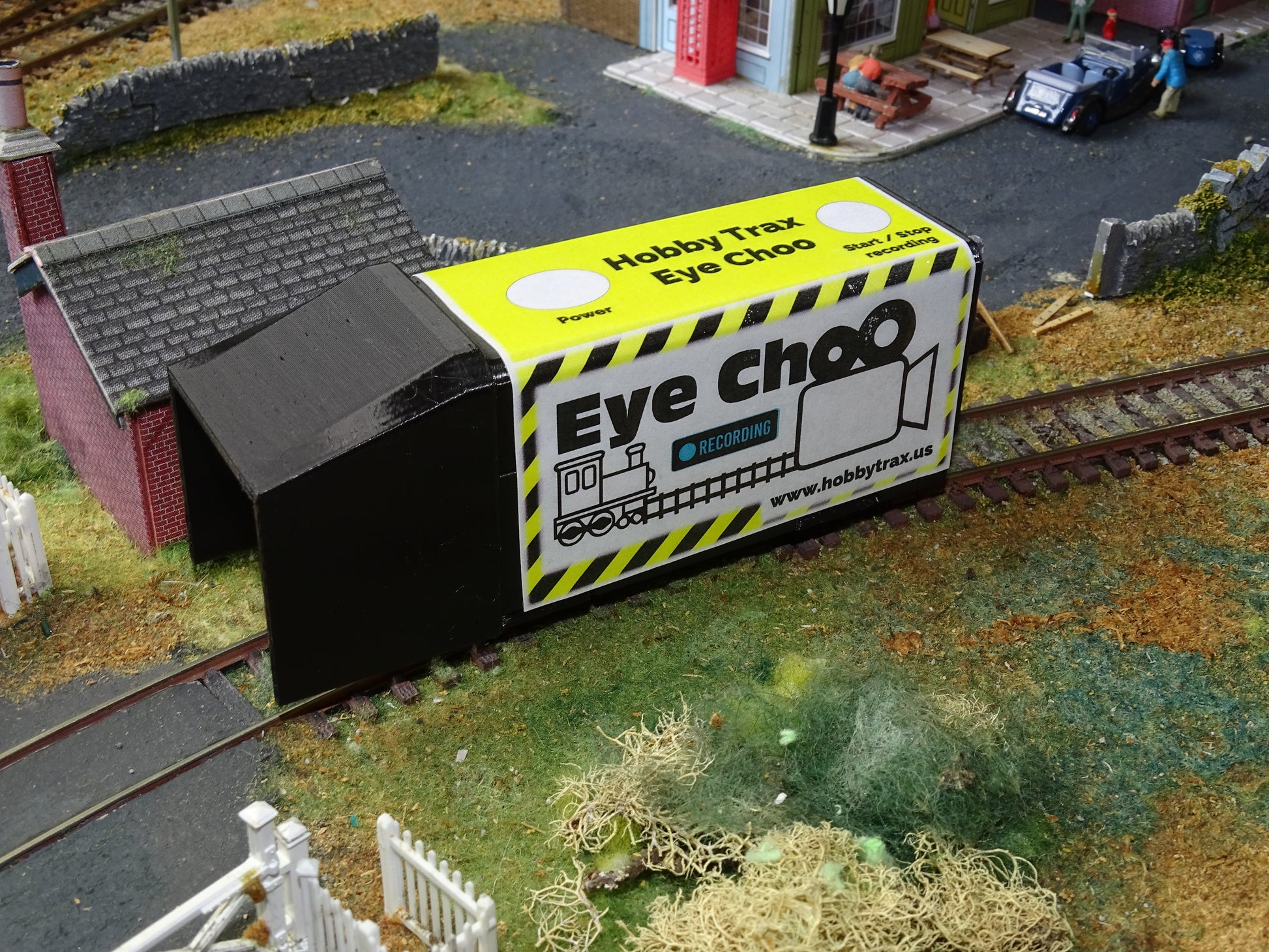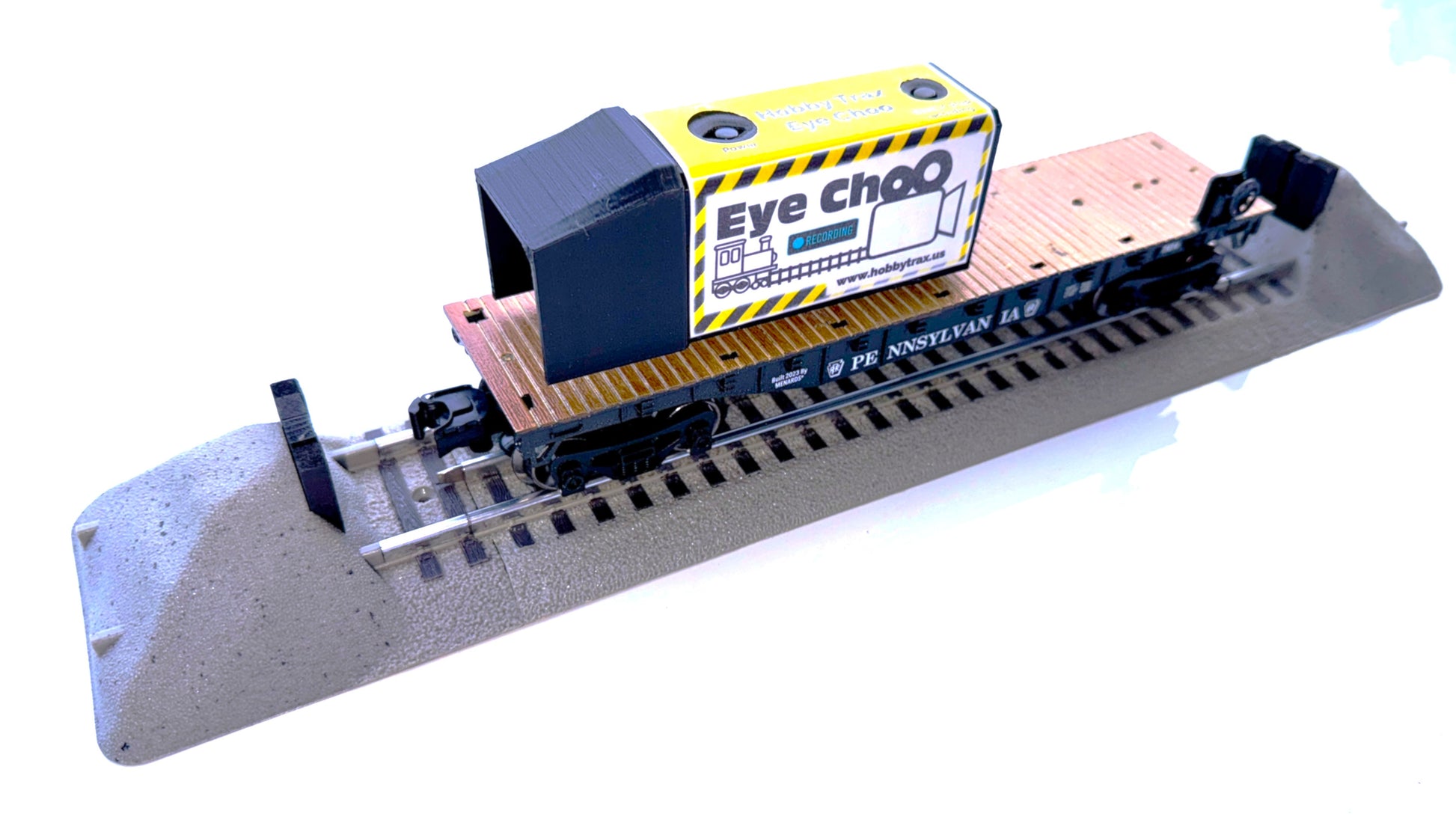 HO scale. For larger scales, wheels can be removed and camera placed on a suitable flatcar (i.e. one with no obstructions such as bulkheads or brake stands/wheels). See photo of Eye-Choo on an O Scale flat car. For larger scales, Eye-Choo can even be mounted sideways to take passenger views!
