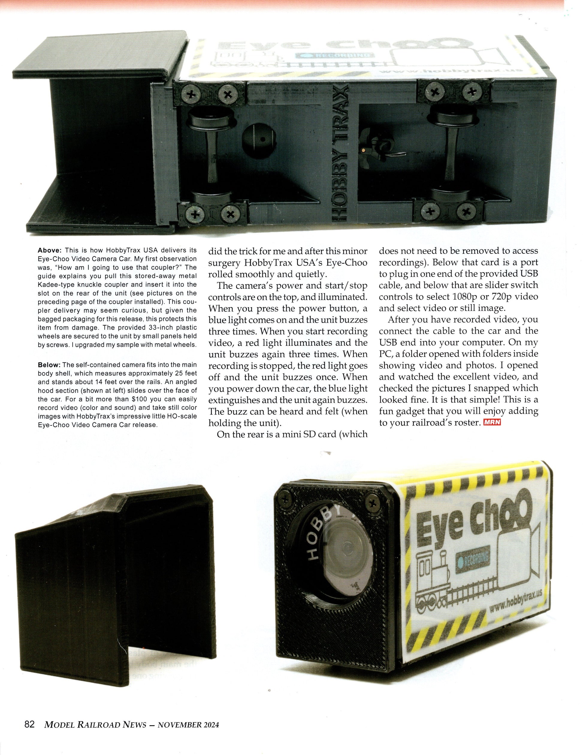 Supplied as a complete and ready to run with: Camera wagon, SD Card, USB cable, Drivers-eye view hood and full instructions. Kadee compatible magnetic coupler and metal wheels.
